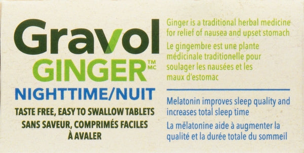 Gravol Tablets Ginger Nighttime (6X16'S) – 16'S — Nighttime tablets containing certified organic ginger and a small amount of melatonin to relieve nausea and help you rest. Case format: 6 × 16'S.