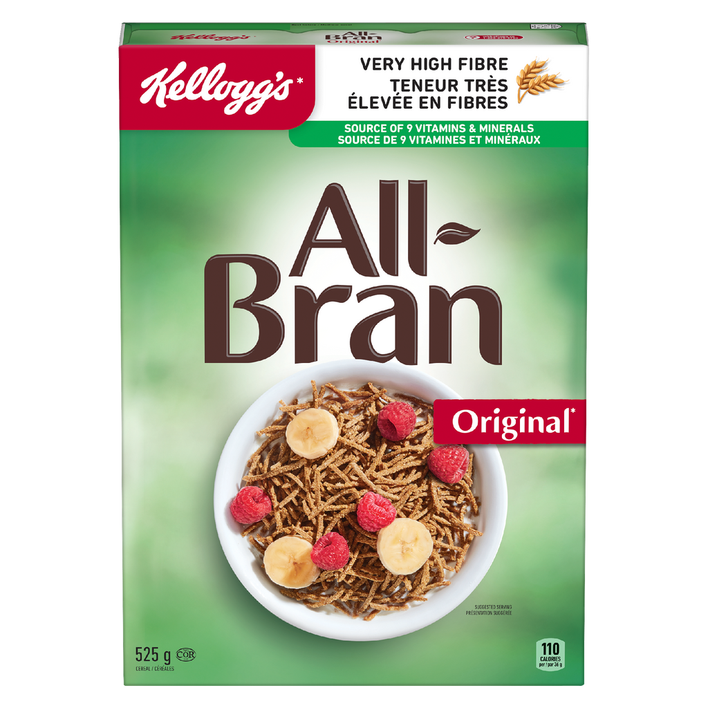 Kelloggs Cereal All-Bran is packed with wheat bran fibre to aid in maintaining everyday digestive wellbeing and is high in fibre, providing 44% of the recommended daily fibre requirement.