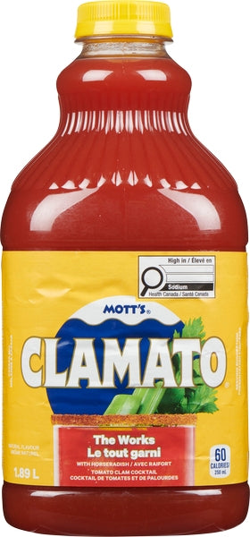 Motts Clamato Juice (8X1.89L) - Extra Spicy - spicy tomato‑clam cocktail juice used to make classic Caesars or enjoyed on its own. Case format: 8 x 1.89 L.