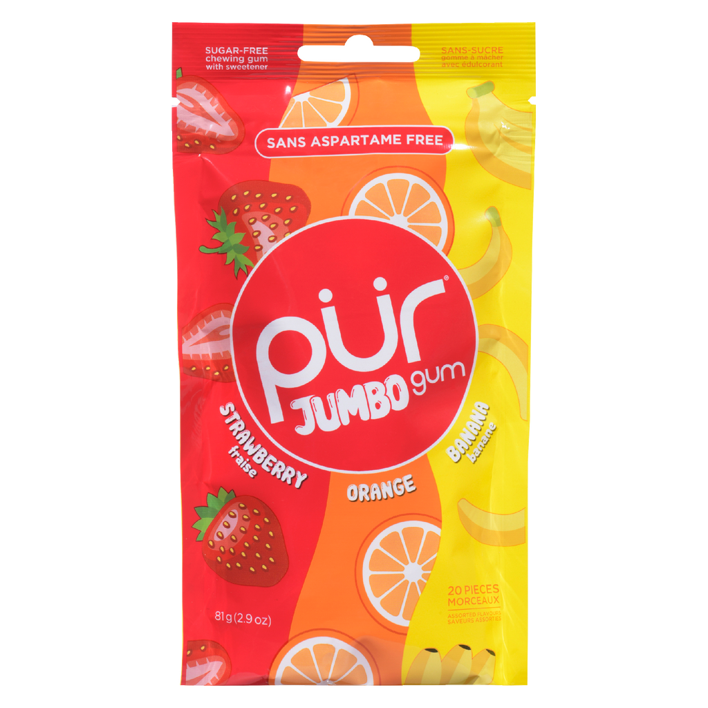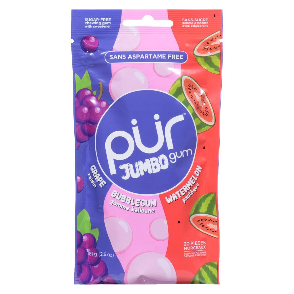 Pur Gum Jumbo ( 10 X 81G ) – Grape Bubblegum Watermelon — Aspartame‑free and sugar‑free gum made with 100% xylitol for a naturally sweet burst of fruit flavours. Case format: 10 × 81 g.