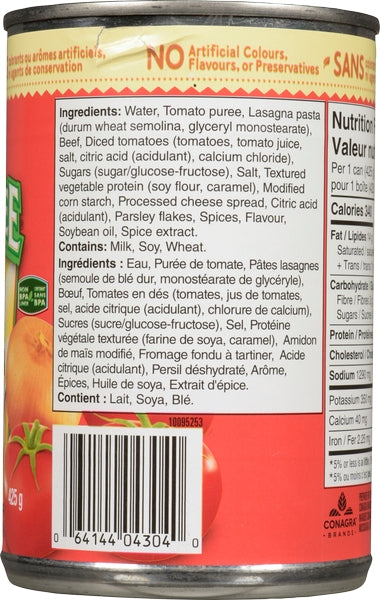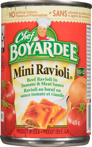 Options - Case Format : ( 24 X 425G ) - Beef Ravioli, Beefaroni, Lasagna, Mini Ravioli, Spaghetti & Meatballs