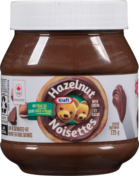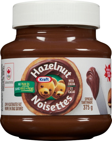 Make the simplest things extra special with Kraft Hazelnut Spread with Cocoa, Less Sugar, which has 45% less sugar than our original Kraft Hazelnut Spread. Made from roasted hazelnuts, skim milk and cocoa, itÕs irresistibly rich and creamy. Our delicious spread is made with no palm oil and is low in saturated fat. Whether used as a breakfast spread on toast, pancakes or crepes, your family will savour every bite. Eat our tasty hazelnut spread by the spoonful or dip fruits like strawberries into it for a fun, quick snack! Every occasion becomes fun thanks to our hazelnut spread. Proudly prepared in Canada. Absence of palm oil does not imply a product is more sustainable than products with palm oil.