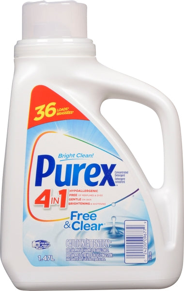 Purex Liquid Laundry Detergent Free & Clear – 1.47L — Unscented and hypoallergenic; tough on dirt yet gentle on your skin with a unique blend delivering the same incredible clean without perfumes or dyes. Case format: 1 × 1.47 L.